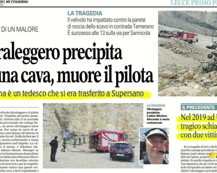ULTRALEGGERO PRECIPITA IN UNA CAVA: PILOTA MORTO CARBONIZZATOLeggi tutto